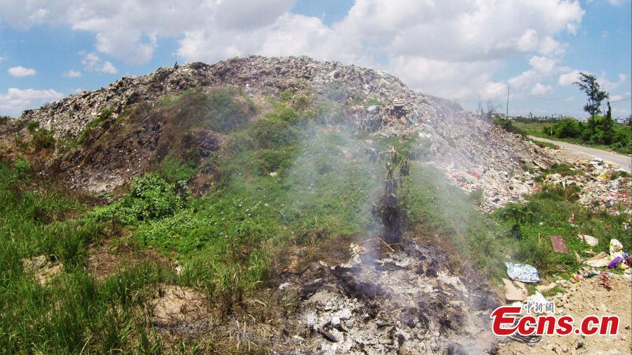 Garbage piles up at a site in Jinshan town of Wenchang city, South China’s Hainan province, Aug 6, 2015. The garbage has been left there for more than 20 years without being processed, rising to meters in height and emitting a terrible smell. Viewed from the air, it looks like a giant scar in a field of green plants. (Photo: China News Service/Wang Xiaobin)