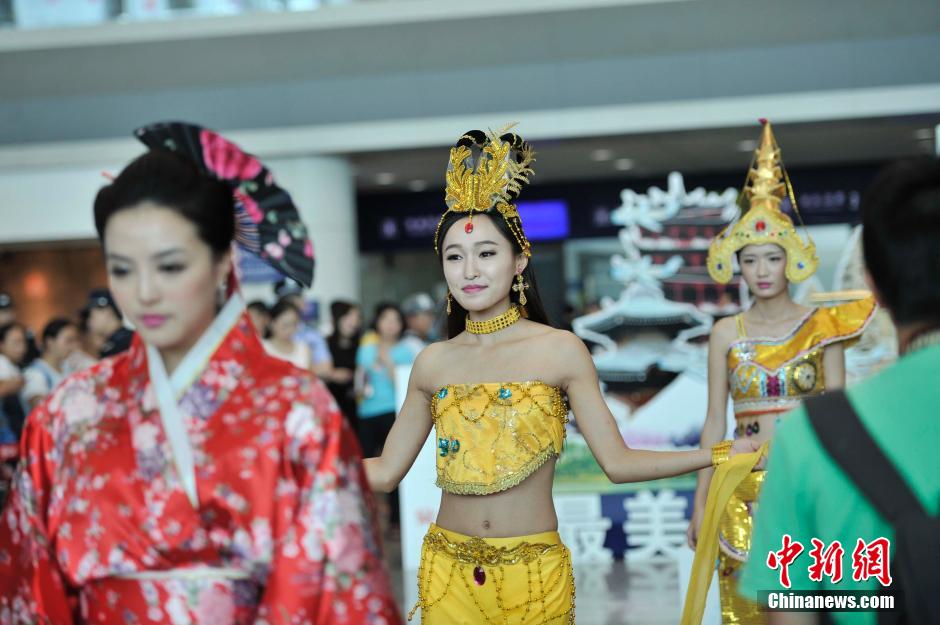 A live show of microlandschafts of popular travel destinations is held in Chongqing airport on Aug. 6, 2015. Beauties in ethnic costumes show microlandschafts in Chongqing, South Korea, Japan, Rome, Thailand, Dunhuang, Harbin, Tibet and other places in the world. (Photo by China News Agency/ Chen Chao)