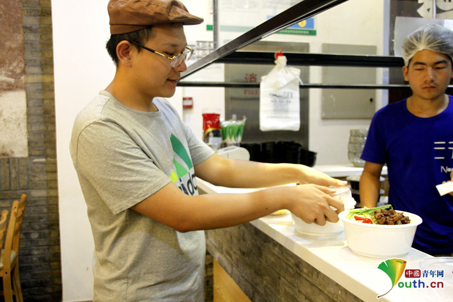 Zhao Heng busily works in the kitchen. (Youth.cn/Wang Jing)