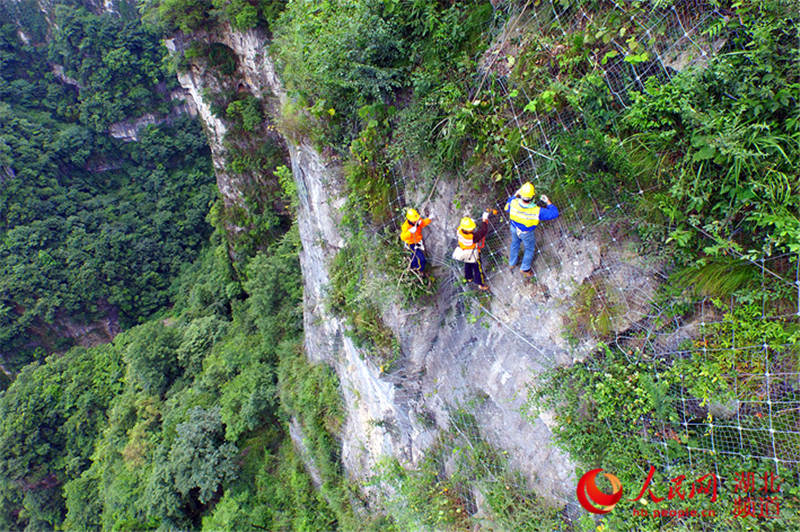 Workers climb the cliff to patrol the Yiwan Railway. (Photo/People's Daily Online)