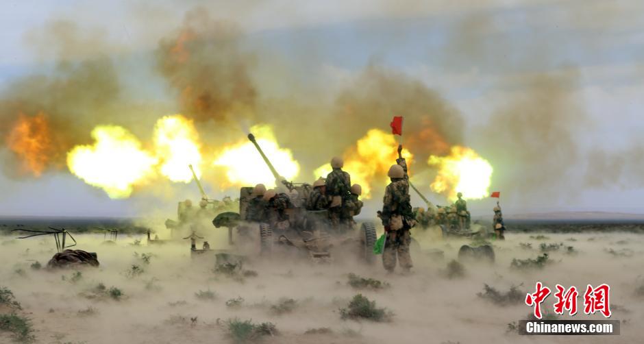 An antiaircraft artillery regiment of the 54th Group Army of the PLA conducts live fire training in desert in August 2015. (Photo/CNS)