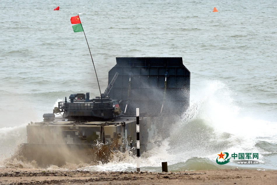 Chinese Marine Corps wins the infantry fighting vehicle racing on the beach of Kaspiysk in the 2015 Russian International Games Competition on Aug. 7, 2015. (Photo/www.81.cn)