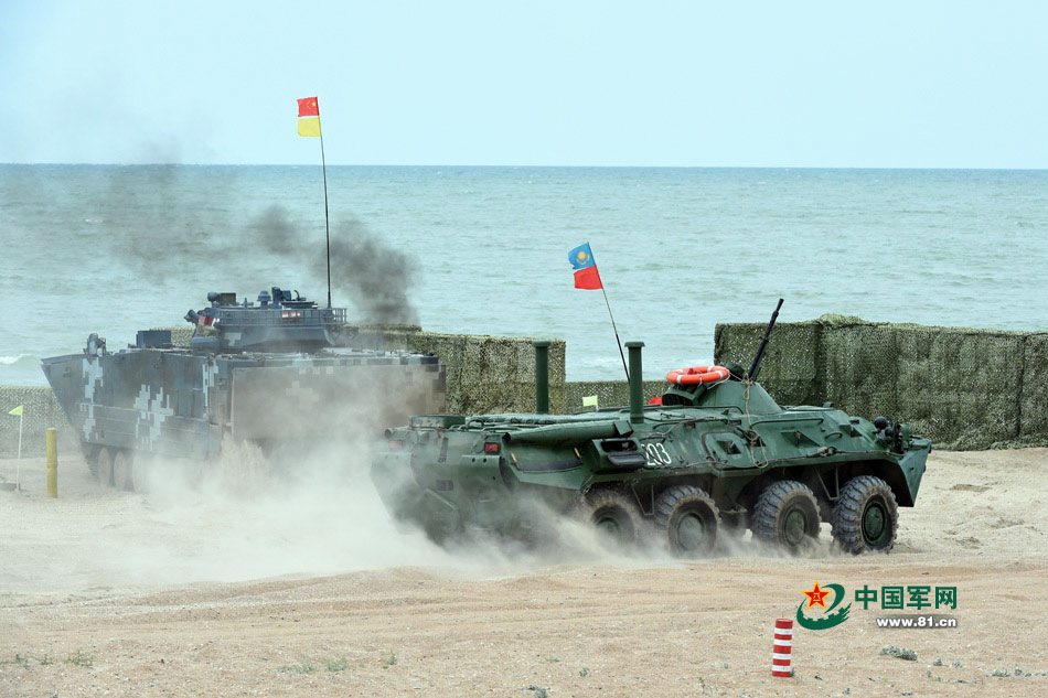 Chinese Marine Corps wins the infantry fighting vehicle racing on the beach of Kaspiysk in the 2015 Russian International Games Competition on Aug. 7, 2015. (Photo/www.81.cn)