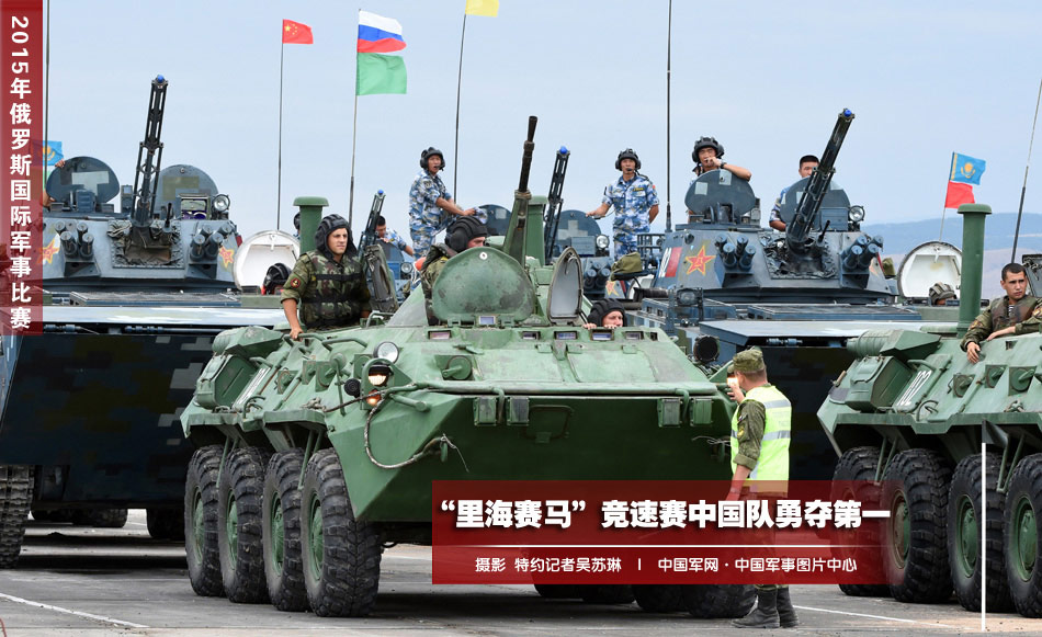Chinese Marine Corps wins the infantry fighting vehicle racing on the beach of Kaspiysk in the 2015 Russian International Games Competition on Aug. 7, 2015. (Photo/www.81.cn)