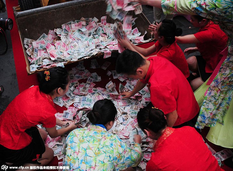 Performers count the banknotes given by tourists as gratuity after work on Aug. 9, 2015.Songcheng is a cultural theme park in Hangzhou which, along with the city's famous West Lake, has become an indispensable place to visit on the itinerary of travelers to the provincial capital of Zhejiang in eastern China. (Photo/ CFP)