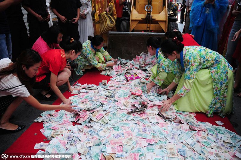 Performers count the banknotes given by tourists as gratuity after work on Aug. 9, 2015.Songcheng is a cultural theme park in Hangzhou which, along with the city's famous West Lake, has become an indispensable place to visit on the itinerary of travelers to the provincial capital of Zhejiang in eastern China. (Photo/ CFP)