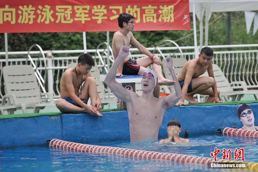 Photos of some famous Chinese swimmers like Sun Yang and Ning Zetao, are placed in a swimming pool in Foreigner's Street in Chongqing in southwest China to encourage others to learn swimming or practice more on August 10, 2015. [Photo: Chinanews.com]