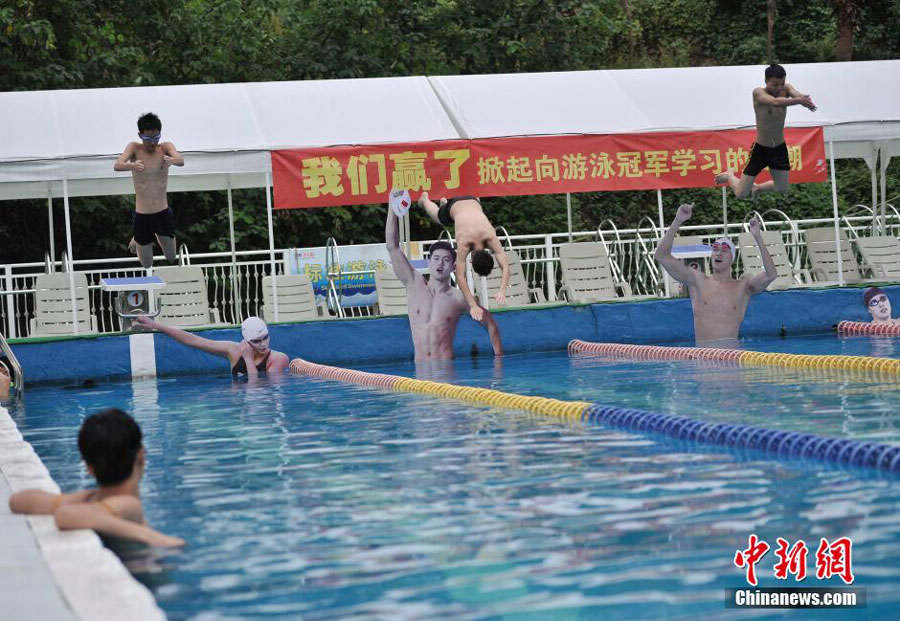 Photos of some famous Chinese swimmers like Sun Yang and Ning Zetao, are placed in a swimming pool in Foreigner's Street in Chongqing in southwest China to encourage others to learn swimming or practice more on August 10, 2015. [Photo: Chinanews.com]