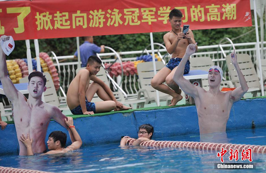 Photos of some famous Chinese swimmers like Sun Yang and Ning Zetao, are placed in a swimming pool in Foreigner's Street in Chongqing in southwest China to encourage others to learn swimming or practice more on August 10, 2015. [Photo: Chinanews.com]