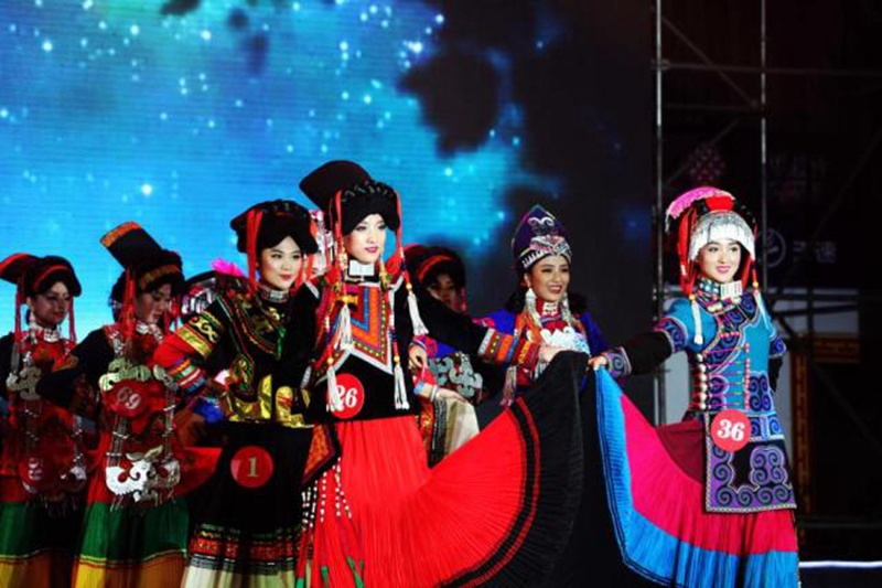 | An annual traditional beauty pageant is held during the seventh international Liangshan Yi Torch Festival in Sichuan’s Yi Autonomous Prefecture on Aug. 9, 2015. Women in traditional Yi costumes performed singing and dancing at the event. (CNS/Gao Han) |