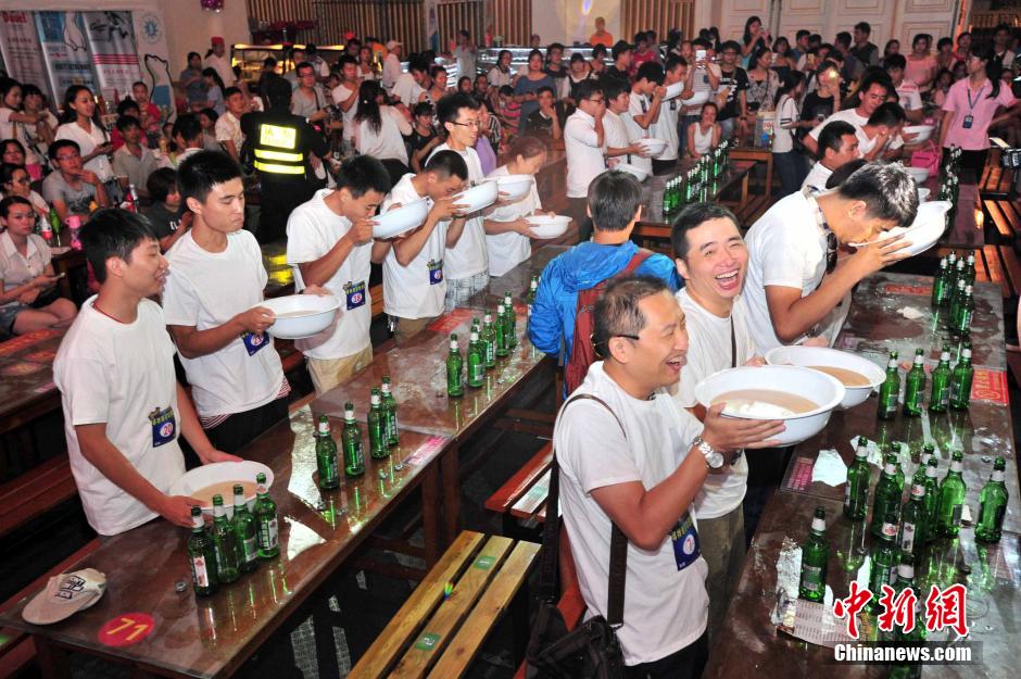 A beer drinking contest is held in Wuhan, central China's Hubei province on Aug. 9. A participant finished a big bowl of beer in 2 minutes. (CNS/Zhong Xin)