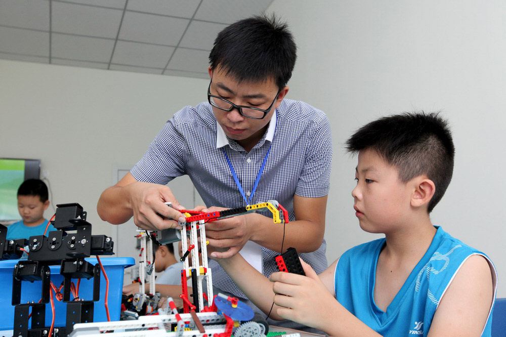On Aug. 9, a primary school student learns to assemble robots in the Science and Technology Museum of Zaozhuang. (Photo by Sun Zhongzhe / Xinhua)