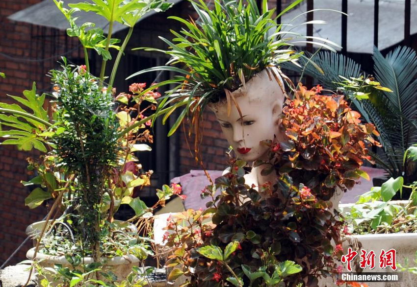 Are head shaped planters creepy to you, or do you love the look of plants that become tendrils of hair above the face of a statue? A man in Sichuan found it interesting to plant flowers inside a recycled plastic model which is a naked woman‘s bust on the rooftop of his apartment. (CNS Photo/ Zeng Meng)