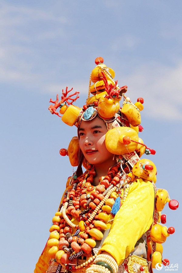 A traditional Tibetan costumes show is held in Zadoi County in northwest China’s Qinghai province on Aug. 7, 2015. Over 140 young men and women wearing Tibetan costumes and precious jewelries participated in the costume performance. (Photo/people.cn)