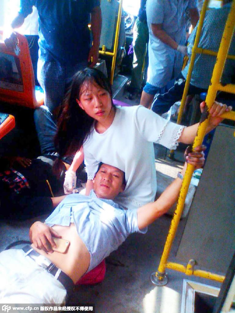 A traffic accident occurred in southwest China's Chongqing on Aug. 4 when the bus Mu Yuping was riding happened to pass the scene. To keep the injured man comfortable, Mu let him lying on her laps for more than 30 minutes until the ambulance arrived.