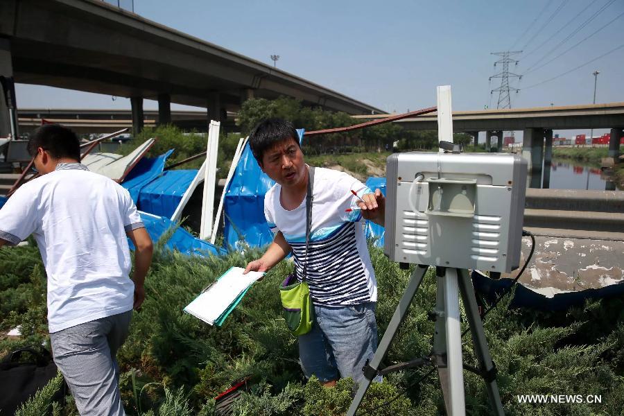 Staff members of Tianjin Environment Monitoring Center monitors air quality near the explosion site in Binhai New Area of Tianjin, north China, Aug. 13, 2015. The death toll has climbed to 44 from two massive blasts that ripped through a warehouse in north China's port city of Tianjin as of Thursday noon, according to rescue headquarters. Twelve firefighters were among the dead. (Xinhua/Jin Liwang)