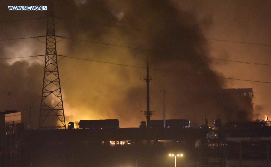 Trucks pass a bridge near the explosion site in the Binhai New Area in north China's Tianjin Municipality, Aug. 13, 2015. The death toll from a Tianjin warehouse blast Wednesday night has climbed to 17, according to rescuers. Another 32 people were critically injured and 283 people are under observation in hospital. (Xinhua/Yue Yuewei)