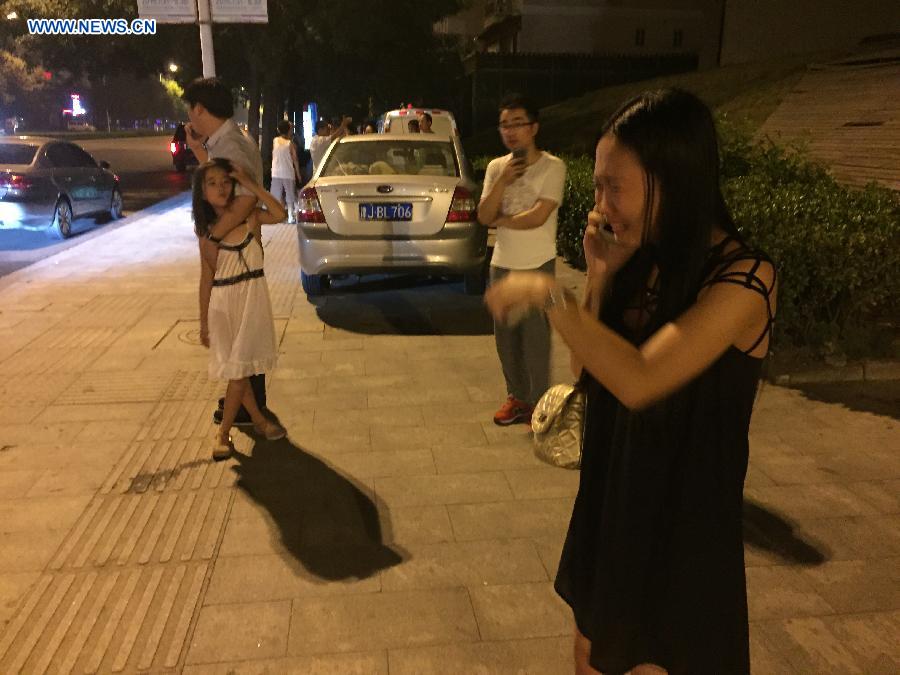 People react after an explosion in the Binhai New Area in north China's Tianjin Municipality, Aug. 12, 2015. The death toll from a Tianjin warehouse blast Wednesday night has climbed to 17, according to rescuers. Another 32 people were critically injured and 283 people are under observation in hospital. (Xinhua)