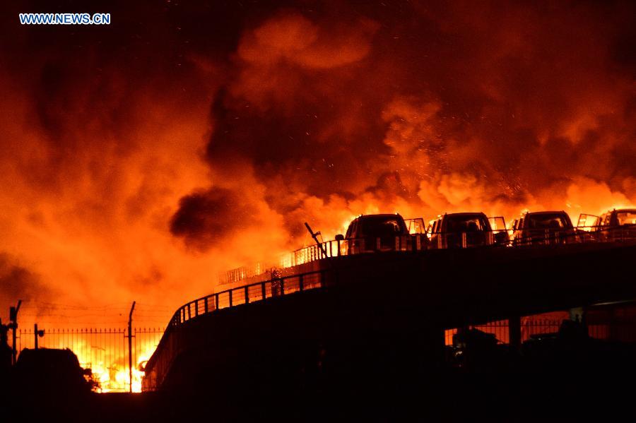 Photo taken on Aug. 13, 2015 shows the burning scene of the explosion site in the Binhai New Area in north China's Tianjin Municipality. The death toll from a Tianjin warehouse blast Wednesday night has climbed to 17, according to rescuers. Another 32 people were critically injured and 283 people are under observation in hospital. (Xinhua)