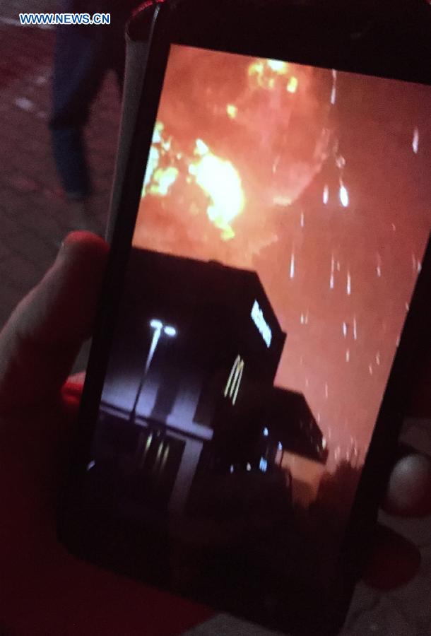 A citizen shows the photo taken during the explosion in the Binhai New Area in north China's Tianjin Municipality, Aug. 12, 2015. The death toll from a Tianjin warehouse blast Wednesday night has climbed to 17, according to rescuers. Another 32 people were critically injured and 283 people are under observation in hospital. (Xinhua)