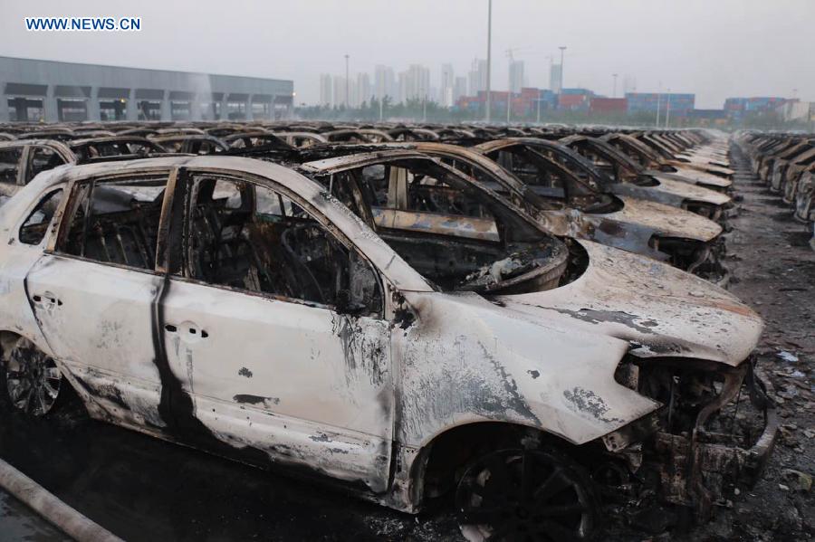 Photo taken on Aug. 13, 2015 shows cars damaged at a car storage near the explosion site in the Binhai New Area in north China's Tianjin Municipality. The death toll from a Tianjin warehouse blast Wednesday night has climbed to 17, according to rescuers. Another 32 people were critically injured and 283 people are under observation in hospital. (Xinhua)