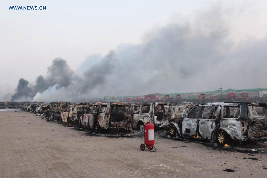 | Photo taken on Aug. 13, 2015 shows cars damaged at a car storage near the explosion site in the Binhai New Area in north China's Tianjin Municipality. The death toll from a Tianjin warehouse blast Wednesday night has climbed to 17, according to rescuers. Another 32 people were critically injured and 283 people are under observation in hospital. (Xinhua) |