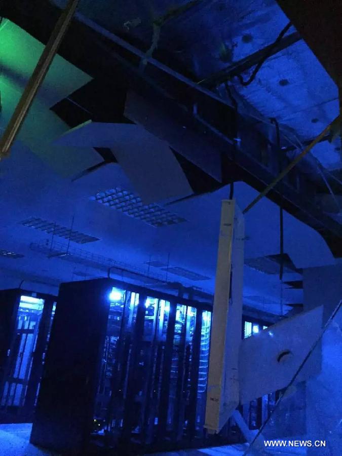 Photo taken on Aug. 13, 2015 shows a damaged building near the site of the explosions in the Binhai New Area in north China's Tianjin Municipality. A series of explosions at a warehouse for dangerous goods in north China's Tianjin Municipality killed at least 17 people. Another 32 people were critically injured and 283 people are under observation in hospital. (Xinhua/Yue Yuewei)