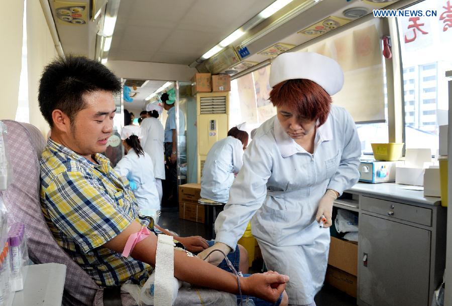 College student Gong Tao donates blood at a blood donation bus at Tianjin Railway Station in Tianjin, north China, Aug. 13, 2015. The death toll has climbed to 44 from two massive blasts that ripped through a warehouse in north China's port city of Tianjin as of Thursday noon, according to rescue headquarters. Twelve firefighters were among the dead. (Xinhua/Yang Baosen)