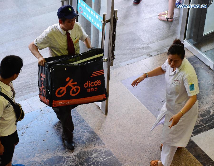 An employee of a local company delivers food for the staff and casualties at the hospital in Tianjin, north China, Aug. 13, 2015. The death toll has climbed to 44 from two massive blasts that ripped through a warehouse in north China's port city of Tianjin as of Thursday noon, according to rescue headquarters. Twelve firefighters were among the dead. (Xinhua/Zhang Chenlin)