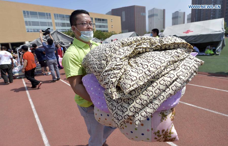 A volunteer carries beddings at the allocation site for people injured in the explosion of the Binhai new district in north China's Tianjin Municipality, Aug. 13, 2015. The death toll rose to 44, including 12 firefighters, from massive warehouse blasts in the northern Chinese port of Tianjin as firefighters continue to battle flames still blazing at the blast site. A total of 520 people have been hospitalized, including 66 critically injured, according to the rescue headquarters. (Xinhua/Yue Yuewei)