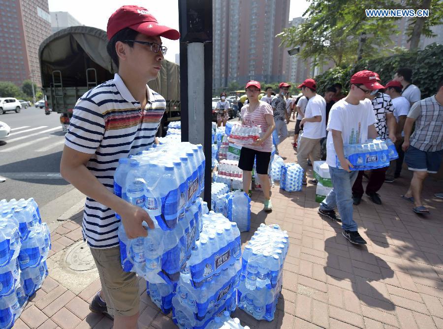 Volunteers carry water at the allocation site for people injured in the explosion of the Binhai new district in north China's Tianjin Municipality, Aug. 13, 2015. The death toll rose to 44, including 12 firefighters, from massive warehouse blasts in the northern Chinese port of Tianjin as firefighters continue to battle flames still blazing at the blast site. A total of 520 people have been hospitalized, including 66 critically injured, according to the rescue headquarters. (Xinhua/Yue Yuewei)