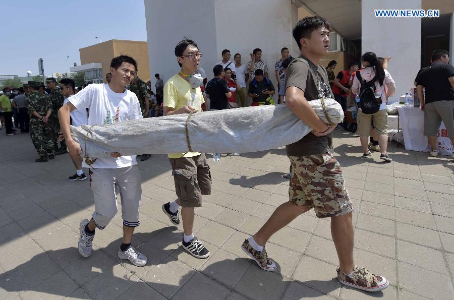 Volunteers carry tents at the allocation site for people injured in the explosion of the Binhai new district in north China's Tianjin Municipality, Aug. 13, 2015. The death toll rose to 44, including 12 firefighters, from massive warehouse blasts in the northern Chinese port of Tianjin as firefighters continue to battle flames still blazing at the blast site. A total of 520 people have been hospitalized, including 66 critically injured, according to the rescue headquarters. (Xinhua/Yue Yuewei)