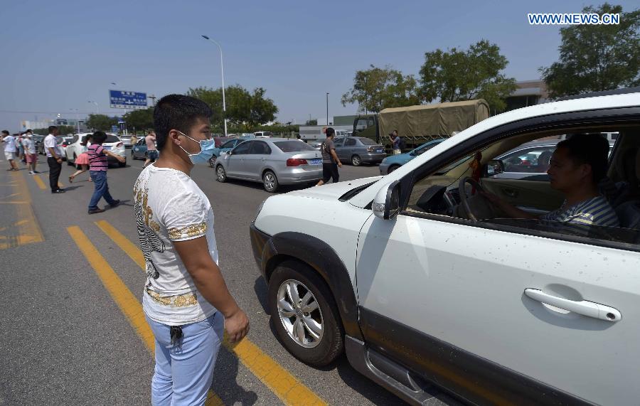 Volunteers guide cars at the allocation site for people injured in the explosion of the Binhai new district in north China's Tianjin Municipality, Aug. 13, 2015. The death toll rose to 44, including 12 firefighters, from massive warehouse blasts in the northern Chinese port of Tianjin as firefighters continue to battle flames still blazing at the blast site. A total of 520 people have been hospitalized, including 66 critically injured, according to the rescue headquarters. (Xinhua/Yue Yuewei)