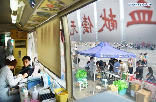 People queue to donate blood outside a blood donation bus at Tianjin Railway Station in Tianjin, north China, Aug. 13, 2015.