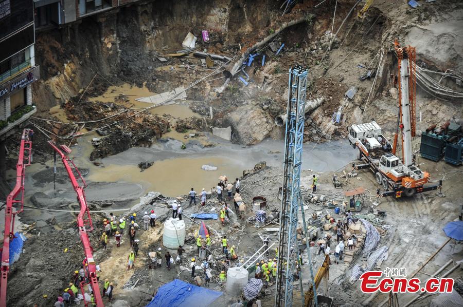 Workers fill a cave-in with cement at a subway construction site in Dongguan city, South China’s Guangdong province, Aug 13, 2015. One worker died after a 300-square-meter area collapsed at the site. A car was also swallowed into the hole during the collapse on Wednesday. The accident also caused water and gas pipelines to burst. (Photo: China News Service/Chen Jimin)