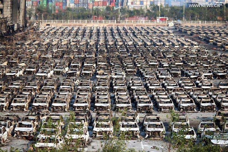 Photo taken on Aug. 13, 2015 shows burnt vehicles near the core area of the explosion site in Tianjin, north China. The death toll from the warehouse explosions in Tianjin city rose to 50 Thursday evening while 701 others were admitted to hospitals, rescue headquarters said. (Xinhua/Cai Yang)