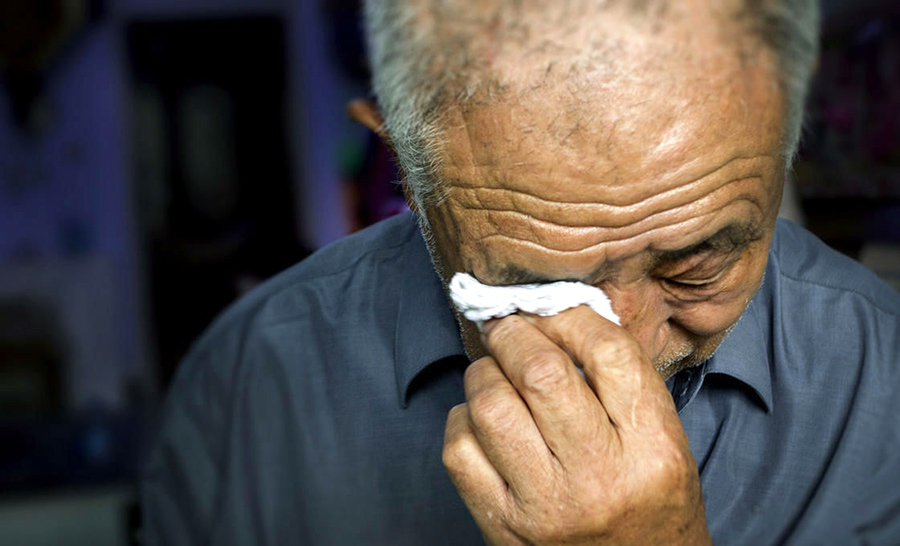 An old man, Wang’s father, cried when he saw the granddaughter crying for her father. (Photo by Zhao Zhiqiang / ChinaDaily)