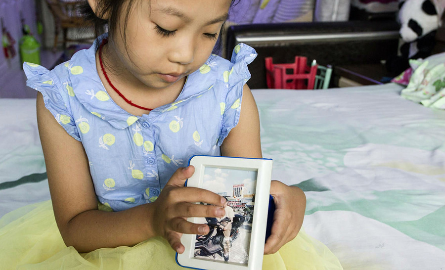 ”This is my dad Wang Yongli, he was very kind and always rode me out. I miss him badly,” Wang Han, a 7-year-old girl, cries at the sight of her father’s photo.