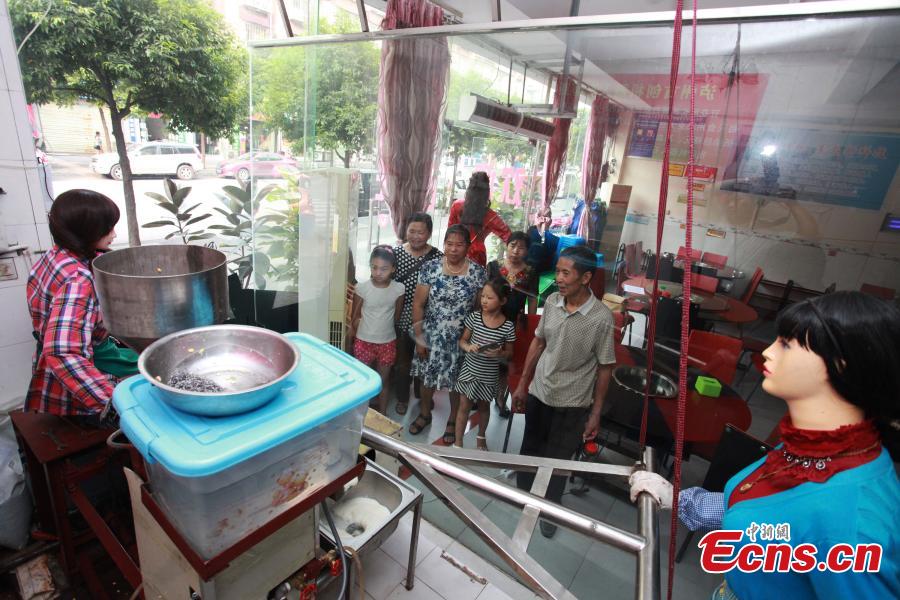 A robot controlled by retired engineer Zou Shumin, 72, makes tofu pudding at a restaurant in Luzhou city, Southwest China’s Sichuan province, Aug 14, 2015. (Photo: China News Service/Liu Chuanfu)