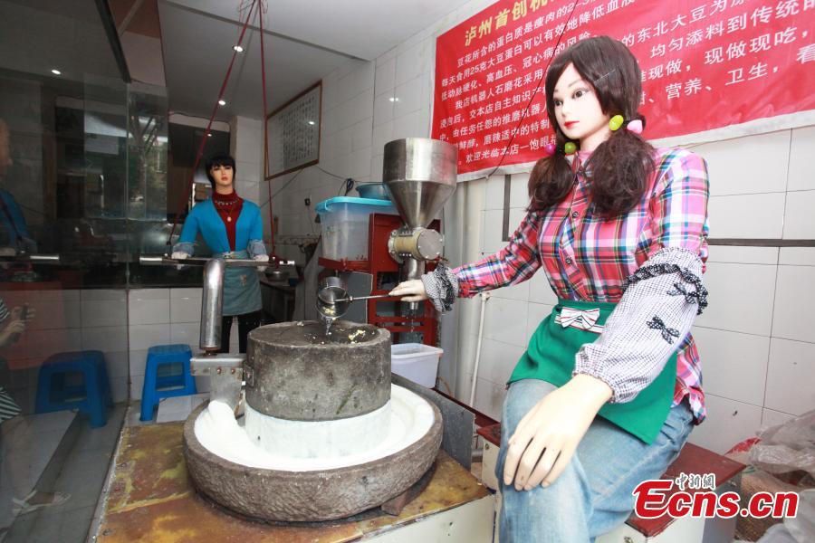 A robot controlled by retired engineer Zou Shumin, 72, makes tofu pudding at a restaurant in Luzhou city, Southwest China’s Sichuan province, Aug 14, 2015. (Photo: China News Service/Liu Chuanfu)