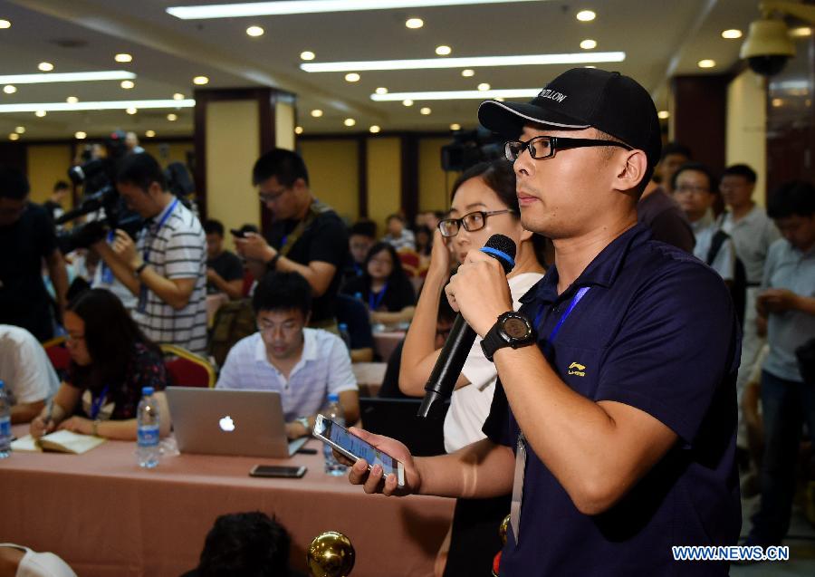 | A journalist asks questions during a press conference on the explosion of Wednesday night in north China's Tianjin, Aug. 14, 2015. The air and water quality in the blasts area in Tianjin is closely monitored, as on-site conditions are still unclear. (Xinhua/Zhang Chenlin) |