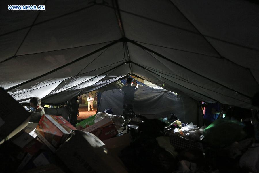 Volunteers erect tents at a temporary shelter in No. 2 Elementary School of the Binhai New District Development Zone in Tianjin, north China, Aug. 13, 2015. An explosion, which occurred Wednesday night at a warehouse in Binhai, has left 50 people dead and 701 others injured. (Xinhua/Shen Bohan)