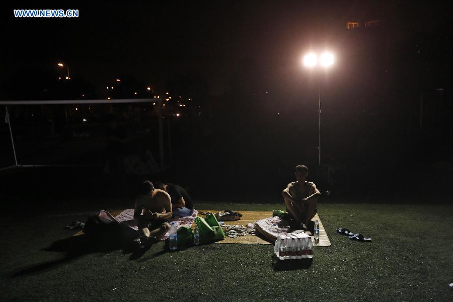 People rest at a temporary shelter in No. 2 Elementary School of the Binhai New District Development Zone in Tianjin, north China, Aug. 13, 2015. An explosion, which occurred Wednesday night at a warehouse in Binhai, has left 50 people dead and 701 others injured. (Xinhua/Shen Bohan)