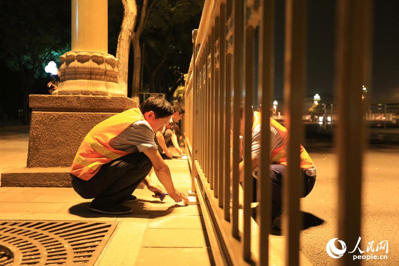 Workers replace the guardrails on Chang'an Avenue. (People's Daily/Yu Ronghua)