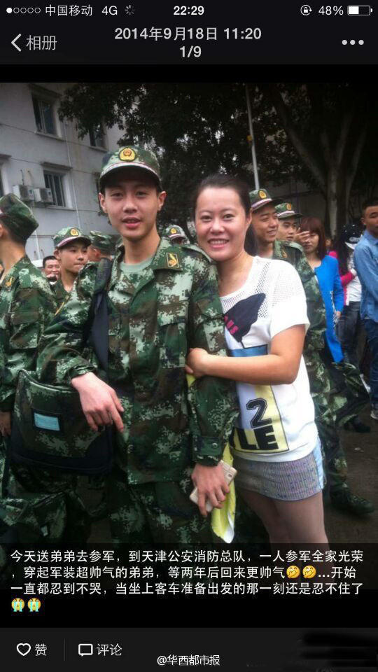 His elder sister posts his picture in military uniform on the day he joined the army, praising him a handsome boy. (Photo from Weibo)