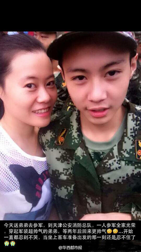 Yuan Hai and his sister on the day he joined the army. (Photo from Weibo)
