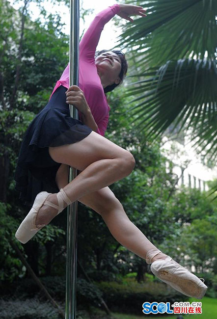 | Dai Dali, 70, practices pole dancing in Chengdu city, capital of southwest China's Sichuan province. (Photo/ scol.com.cn) |