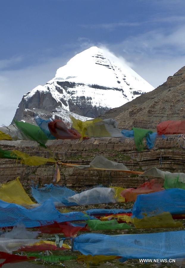 Photo taken on Aug. 7, 2015 shows the sacred Mount Kangrinboqe and prayer flags at the foot of the mountain in Burang County of Ngari Prefecture, southwest China's Tibet Autonomous Region. (Xinhua/Liu Dongjun)