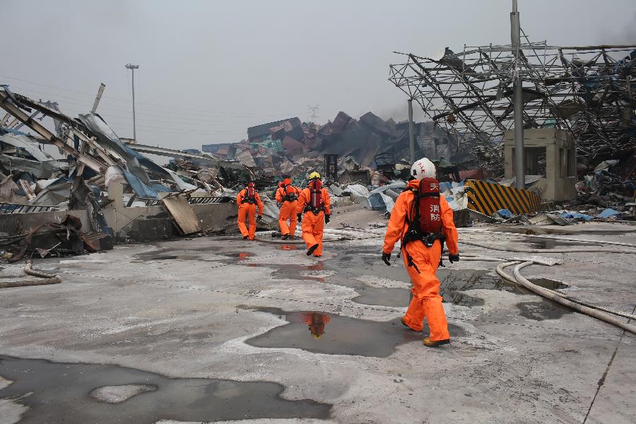 Firefighters wearing chemical protective clothing work in the core area of explosion site in Tianjin, north China, Aug. 15, 2015. Death toll rose to 85 as of Friday night, including 21 firemen, from the massive warehouse explosions hitting north China's Tianjin City Wednesday night, the rescue headquarters said Saturday. Meanwhile, 721 others were hospitalized, including 25 critically wounded and 33 in serious condition. (Xinhua/Jin Liwang)