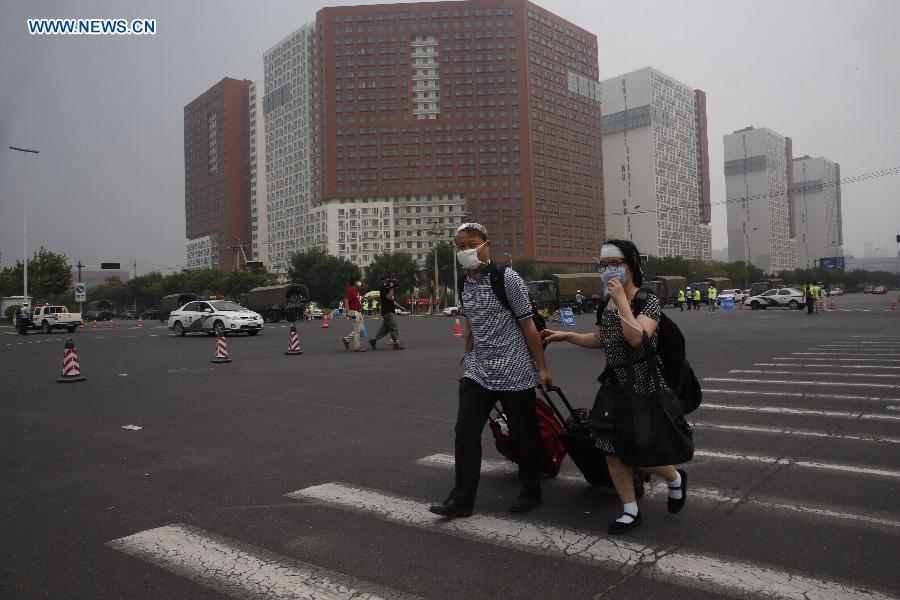 Residents rush to leave after getting an evacuation order near the core area of explosion site in Tianjin, north China, Aug. 15, 2015. All people within 3-km radius are required to evacuate from Tianjin blasts site. (Xinhua/Shen Bohan)